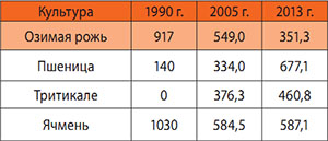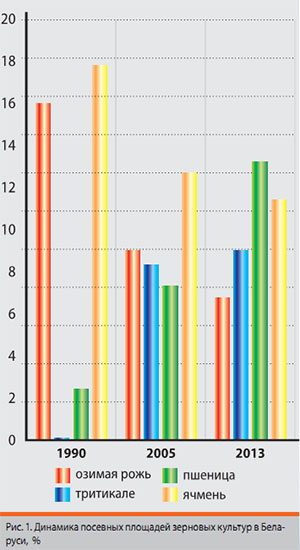 Однако в Беларуси, несмотря на заметный рост урожайности новых сортов и гибридов ржи, наблюдается сокращение ее посевных площадей ‒ в 2,6 раза по сравнению с 1990 годом (табл. 1, рис. 1). В то же время расширяются посевы озимой и яровой пшеницы, тритикале, рапса и кукурузы
