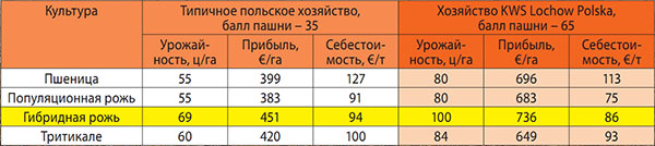 Способность давать высокий урожай на разных уровнях плодородия подтверждается результатами сортоиспытания и производственных опытов в различных странах Европы. При испытании в Польше, России и Украине была выявлена эффективность возделывания гибридной ржи на почвах как со средним, так и c высоким уровнем плодородия. Так, в производственных испытаниях в Польше она показала и максимальную урожайность ‒ от 69 до 100 ц/га (в зависимости от плодородия почвы) и обеспечила наибольшую прибыль по сравнению с пшеницей, популяционной рожью и тритикале (табл. 2).