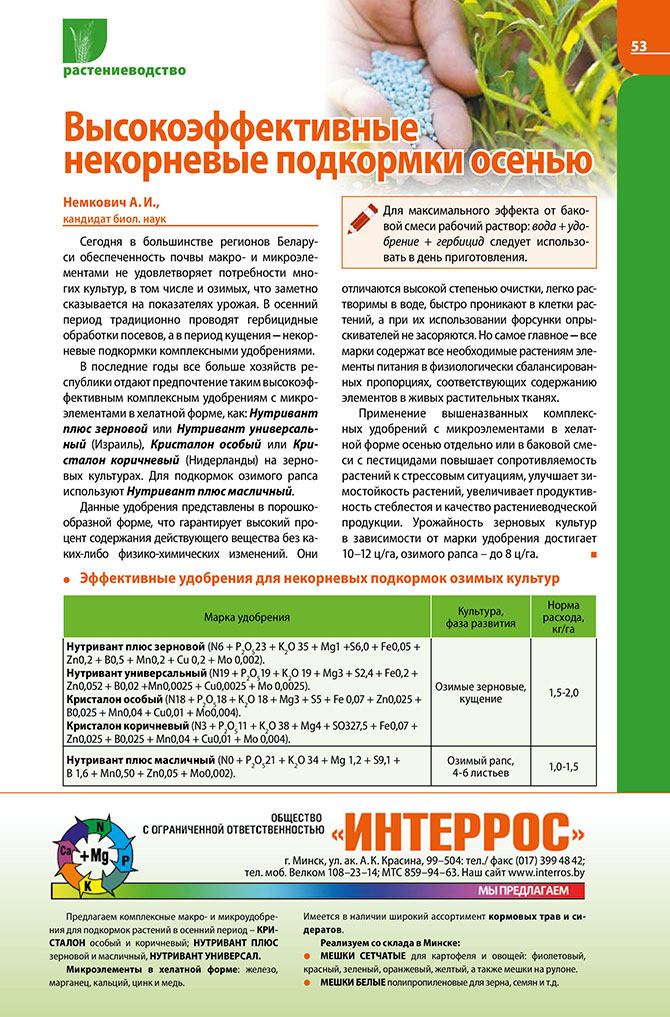 Немкович А.И. Высокоэффективные некорневые подкормки осенью