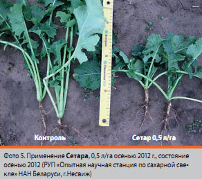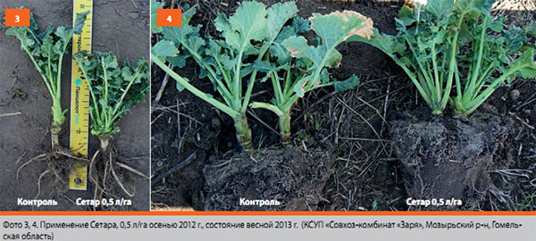 Для успешной перезимовки растения рапса должны достигнуть оптимальных параметров развития: розетка 8–12 настоящих листьев, диаметр корневой шейки 10–14 мм и при этом не начинается рост центрального побега, высота точки роста до 2 см, длина хорошо развитого стрежневого корня не должна быть меньше 20 см. При применении Сетара осенью в фазе 4–6 настоящих листьев (0,3–0,5 л/га) паклобутразол способствует удлинению и увеличению объёма корневой системы, утолщению корневой шейки, оптимизации высоты точки роста, что существенно улучшает зимостойкость рапса (фото 3, 4, 5). Применяют Сетар и весной в фазу начала стеблевания (0,5 л/га), при этом препарат снижает высоту растений, повышая их устойчивость к полеганию, стимулирует образование и рост боковых побегов, синхронизирует развитие ярусов рапса. Всё это существенно увеличивает продуктивность растений. Так, по данным РУП «Институт защиты растений», двукратное применение Сетара позволило получить дополнительно 6 ц/га урожая.
