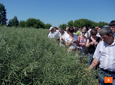 … Следующая остановка – яровой рапс. Здесь участники семинара обратили внимание на то, что цветущее поле буквально «жужжало» от обилия крылатых тружениц. В непосредственной близости от поля находилась пасека. Кроме пчёл, посевы массово посещали мухи-журчалки и другие представители полезной энтомофауны. Как же удалось совместить эффект борьбы с вредителями и содействие пчеловодческому промыслу?