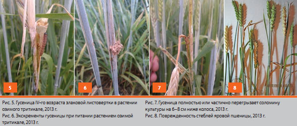 Следует отметить, что из всех продуктивных стеблей растения фитофаг повреждает только один (рис. 8). Питание гусеницы продолжается до молочно-восковой спелости зерна, затем они окукливаются на растениях, там же, где и питались. Через 10–14 дней появляются бабочки (конец июля – август), вылетающие из посевов в лесополосы. Самки откладывают яйца на кору и в трещины деревьев. Зимуют сформировавшиеся гусеницы в яйцевой оболочке на коре деревьев, а весной распространяются на паутинках на посевы зерновых культур.