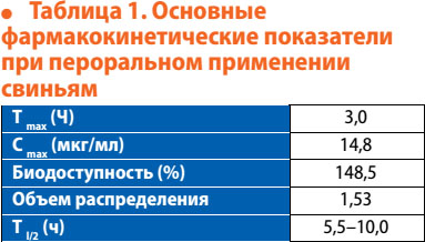 Очень высокая биодоступность при пероральной даче свиньям (табл. 1), вероятно, обусловлена энтерогепатической циркуляцией флорфеникола. Он хорошо проникает в органы и ткани, в т. ч. через гематоэнцефалический барьер, с белками плазмы крови связывается в небольшом количестве (до 18,6%). Достигает высокой концентрации в почках, легких, мочевом пузыре, мышцах, бронхиальном секрете, моче и желчи и в более низкой – в цереброспинальной жидкости и мозговой ткани.