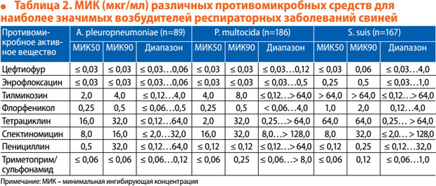 Показатели эффективности флорфеникола invitro в отношении наиболее значимых бактерий, патогенных для свиней. По данным независимых исследований, большинство экономически значимых возбудителей бактериальных заболеваний свиней высокочувствительны к флорфениколу. С. Сальмон и соавт. [2] провели системный обзор данных по минимальной ингибирующей концентрации (МИК) ряда антибактериальных средств в отношении бактериальных агентов, наиболее опасных для свиней (табл. 2).