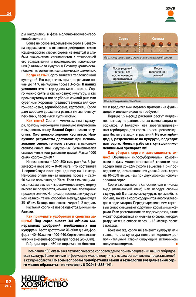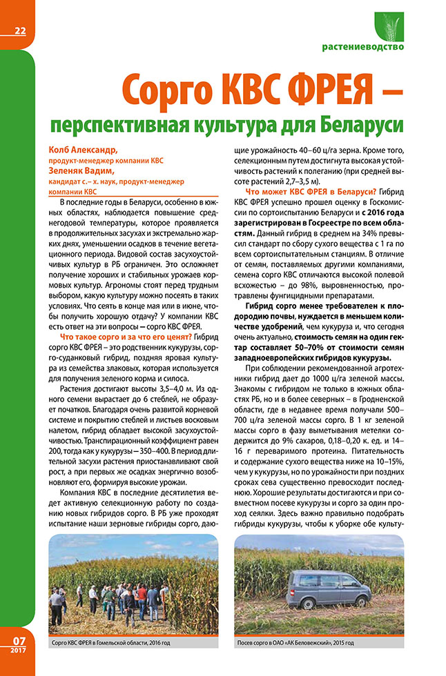 Колб А., Зеленяк В. Сорго КВС ФРЕЯ – перспективная культура для Беларуси