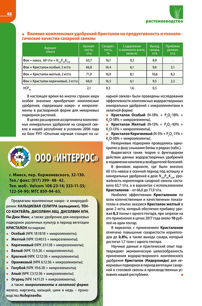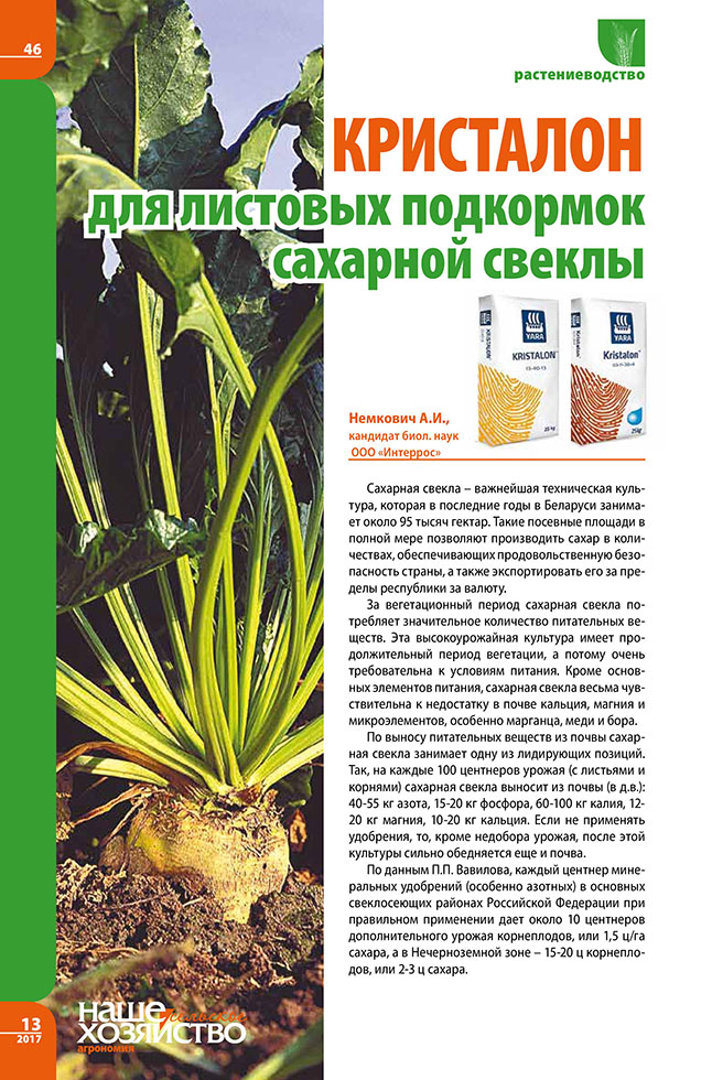 Немкович А.И. Кристалон для листовых подкормок сахарной свеклы
