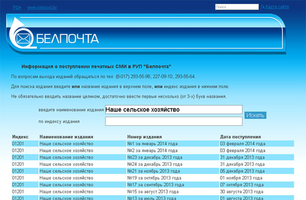 Информацию о поступлении очередного номера журнала "Наше сельское хозяйство" на РУП "Белпочта" можно узнать на сайте: ssp.belpost.by, заполнив верхнюю строку "наименование издания" - "Наше сельское хозяйство"